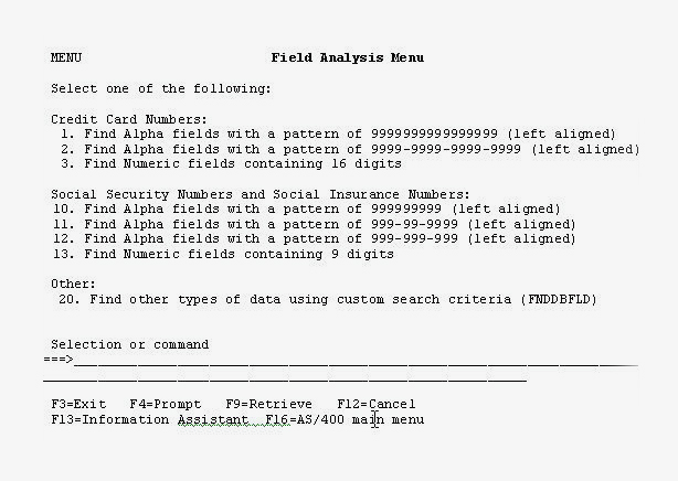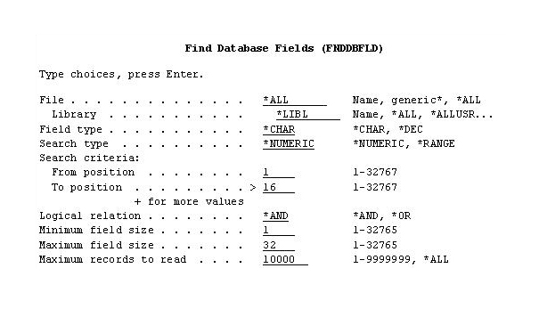 The Find Database Fields (FNDDBFLD) command allows you to find database fields (in physical files and tables) that contain values that meet your search criteria. For instance, you can quickly perform a search for any numeric fields that contain a 16-digit number (e.g. credit card numbers) or perform a search for any alpha fields that contain a numeric pattern like 999-99-999 or 999999999 (e.g. Social Security numbers).