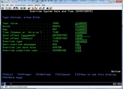 The simplicity of Anydate can be seen in the fact that there is just one screen for interactive date or time changes. Also, there are basically just two commands needed to use Anydate: OVRSYSDATE with the appropriate parameters filled in, and DLTOVRDATE to remove the Anydate simulation.