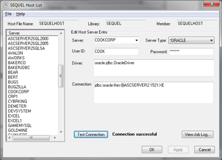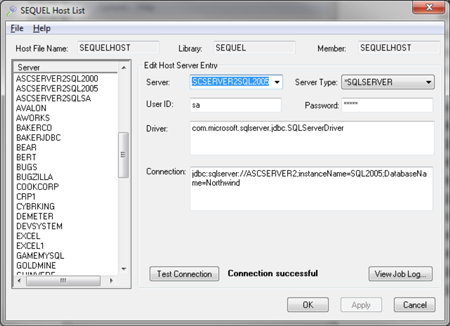 The available remote databases are defined in a database file named SEQUELHOST that is stored on the Power Systems server. The definitions can be created from the ViewPoint Administrator or using the MNTHOSTF command on the IBM i. Each user’s SEQUEL settings indicate the SEQUELHOST file that will be used for their remote database access. This means that user access to remote databases can be controlled by specifying different SEQUELHOST files (or members) for their user settings. The file or member to be used can be maintained through the user’s SEQUEL defaults which can easily be set through the Administrator.