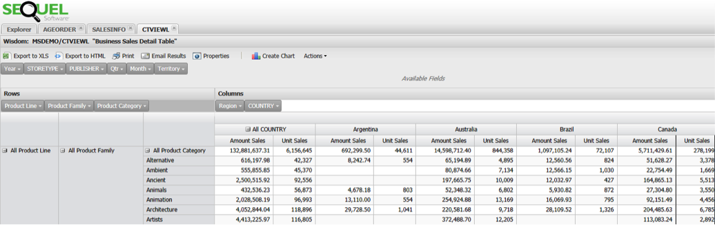 And Sequel Client Tables display interactively for the user to move fields, filter data, and drill into cells. Client Tables appear in summary but can easily be expanded by clicking the Actions button on the tool bar and selecting Expand All.