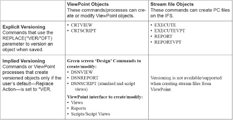 Explicit versioning refers to SEQUEL commands that use the REPLACE parameter. A new value is now allowed for this parameter: *VER. You can also use the value *DFT and have the user’s SEQUEL Default set to *VER. For SEQUEL ViewPoint objects, the commands for create views (CRTVIEW) and create scripts (CRTSCRIPT) can use the new replace value. For PC files on the IFS, the commands EXECUTE, EXECUTEVPT, REPORT, and REPORTVPT can be set to use versioning.