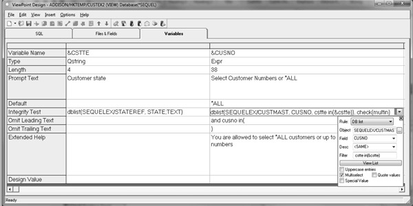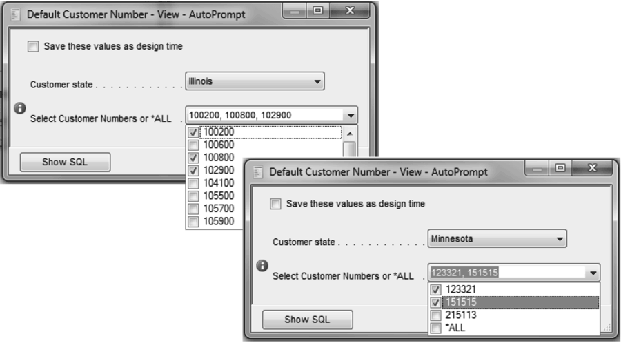 Examples: When you run the view, the variable allows the user to select *ALL for all customers or use the drop-down option to select one or more customers.