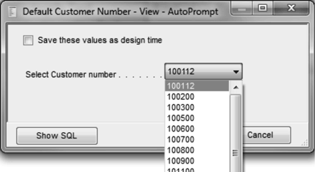 When you run the CUSTEX1 view, the runtime prompt provides a drop-down selection list containing all customer numbers from the CUSTMAST file. The user can select only one of the customer numbers.