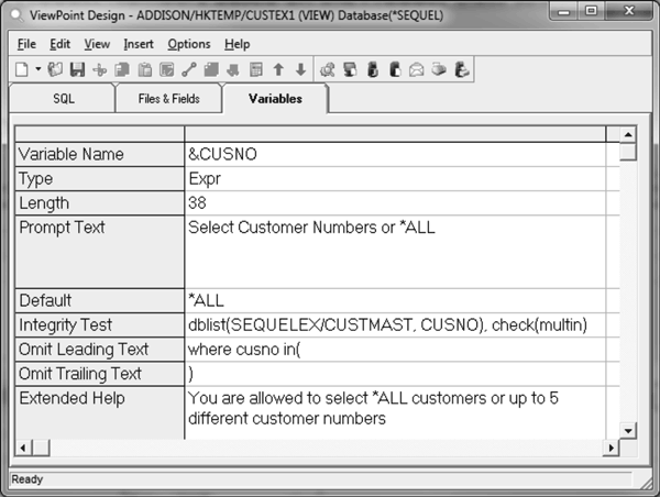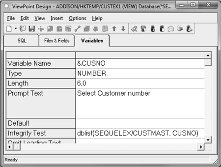 Note: When you define the variable as &CUSNO, SEQUEL ViewPoint creates the variable as a number type. By including a DBList in the variable definition, the runtime prompt provides a drop-down selection list containing all valid customer numbers. By leaving the default value blank, the DBList will provide the default value first at runtime.